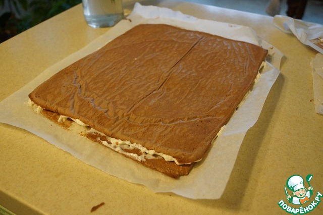 Коржи отделить от бумаги. На один из коржей выложить крем слоем в 1-1,5 см.