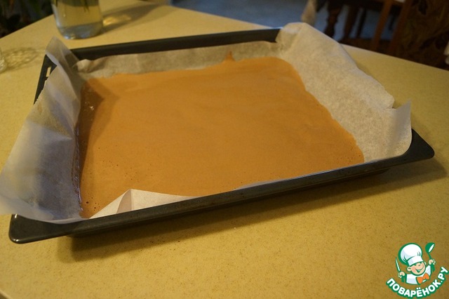 Разделить тесто на 2 части (по емкости посуду, на глаз) На застеленный пергаментной бумагой противень (я делала сразу на двух противнях) выливаем полученную смесь, разравниваем лопаткой поверхность. Выпекаем бисквит (2 шт) в разогретой до 180 градусов духовке около 15- 20 минут.