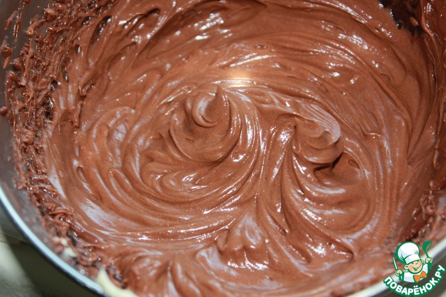 Взбейте 100 г размягченного сливочного масла до посветления. Добавляйте понемногу шоколадную смесь. Тщательно взбивайте. Влейте коньяк и ваниль, взбейте еще раз.
