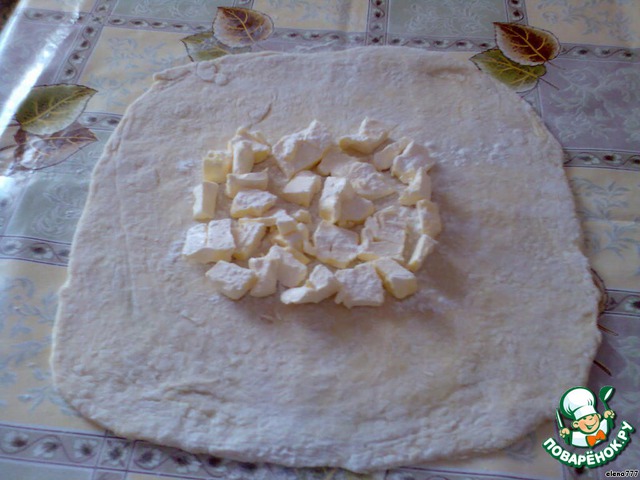 Раскатать тесто на столе, в центр положить мягкий маргарин, порезанный кусочками, в виде квадрата.