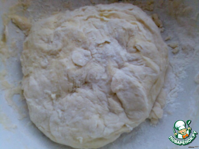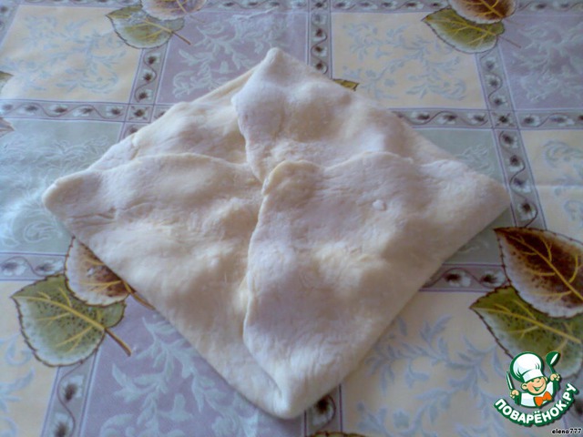 Хорошо раскатать, слегка присыпать мукой, снова загнуть и раскатать, так проделать 4 раза.