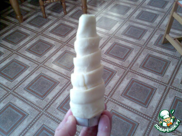 Каждый виток должен находить на другой примерно на 5 мм. Заканчивайте накручивать тесто, не доходя до края 1,5-2 см.