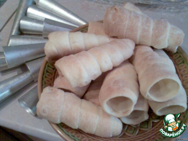 Перед подачей на стол трубочки устанавливаем на блюдо и обсыпаем сахарной пудрой, смешанной с ванилином.