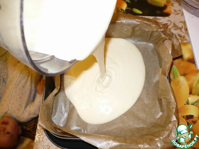 На пергамент влить полученной бисквитное тесто. Выпекать в духовке 20-25 мин. при температуре 180С.