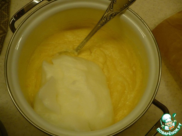 Добавить полученные белки к желткам и сыру "Маскарпоне".