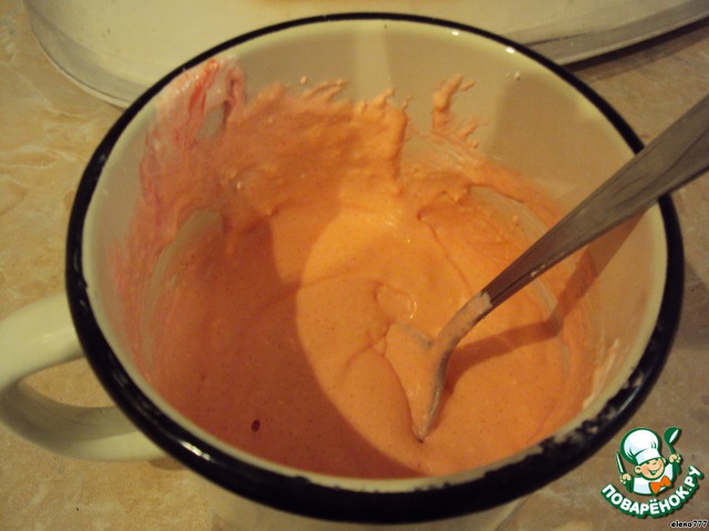 Добавить клубничный сироп (я добавила клубничный ароматизатор), ванильную творожную массу, осторожно перемешать ложкой сверху вниз.