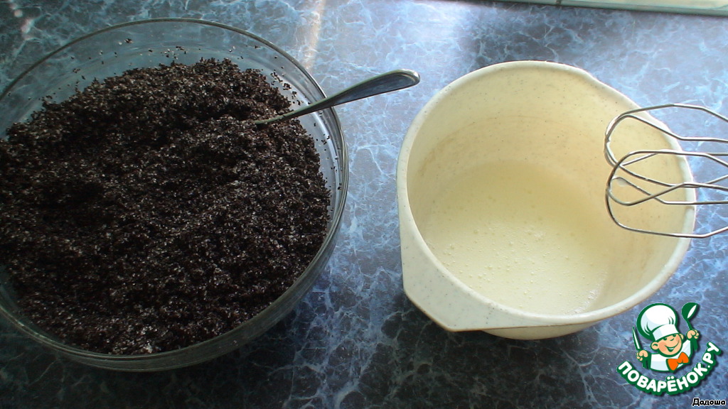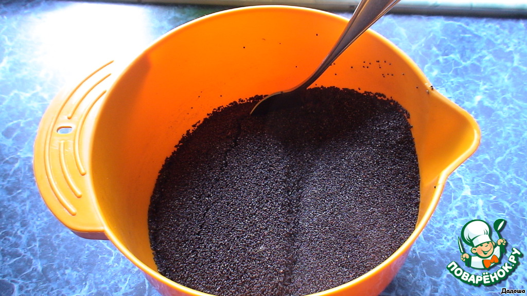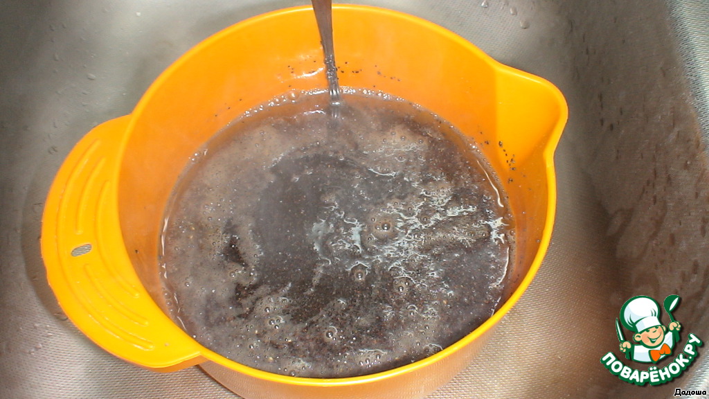 Прежде всего накануне дня выпечки необходимо приготовить начинку. Отвешиваем мак и промываем его крутым кипятком несколько раз, вымыть имеющийся мусор и грязь. Залить водой и тщательно перемешать, дать всему маку намокнуть, а затем он осядет на дно, и можно воду сливать аккуратно. Холодной не подходит, мак не осядет, и Вы не сможете слить воду.