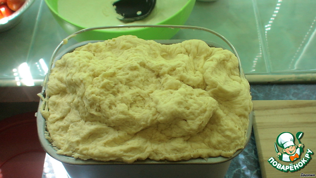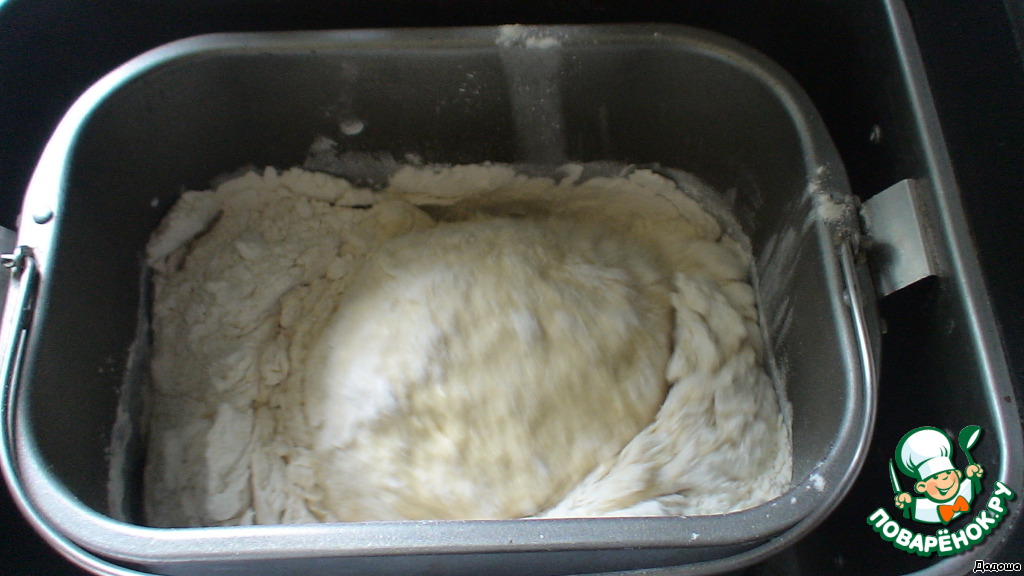 Готовим тесто. Я делаю в хлебочечке. Вливаю жидкость, добавляю сахар, соль, яйца, растопленное масло, дрожди и половину муки. Остальную муку подсыпаю по мере вымешивания теста.