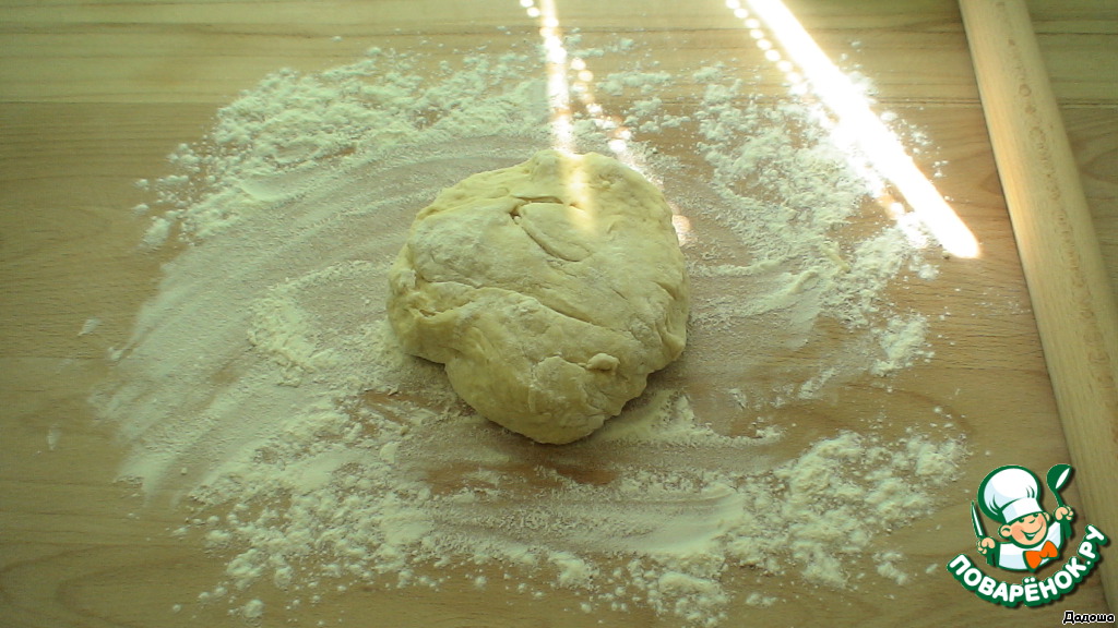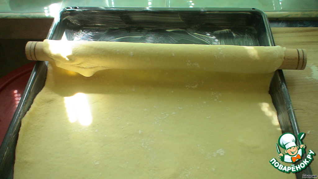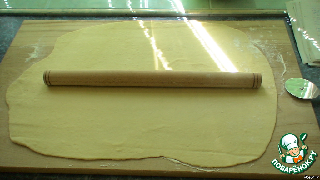 Обрезаем лишнее тесто. Немного подпылить мукой (чтоб не слипся при наматывании) и пласт накручиваем на скалку.