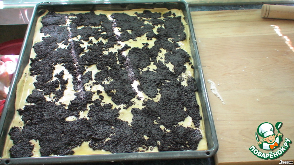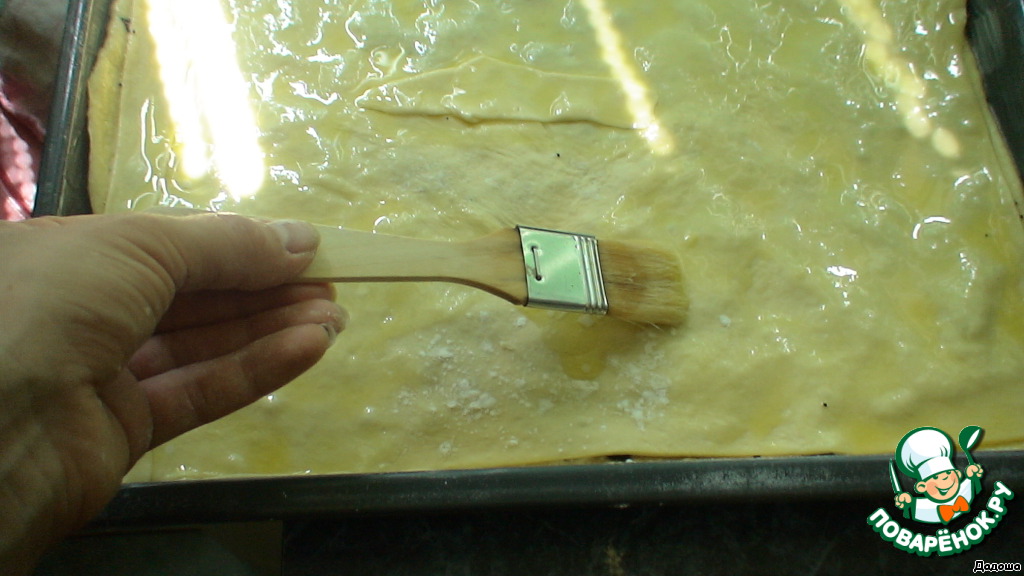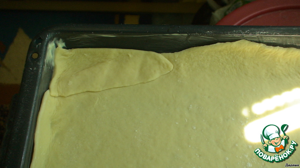 Второй слой теста раскатываем аналогично первому, распределяем на первый слой, притаптываем руками тесто и обильно смазываем растопленным сливочным маслом (100 гр). Так повторяем до верхнего коржа. Верх (та часть, которая осталась побольше) нужно постараться раскатать на величину деко.