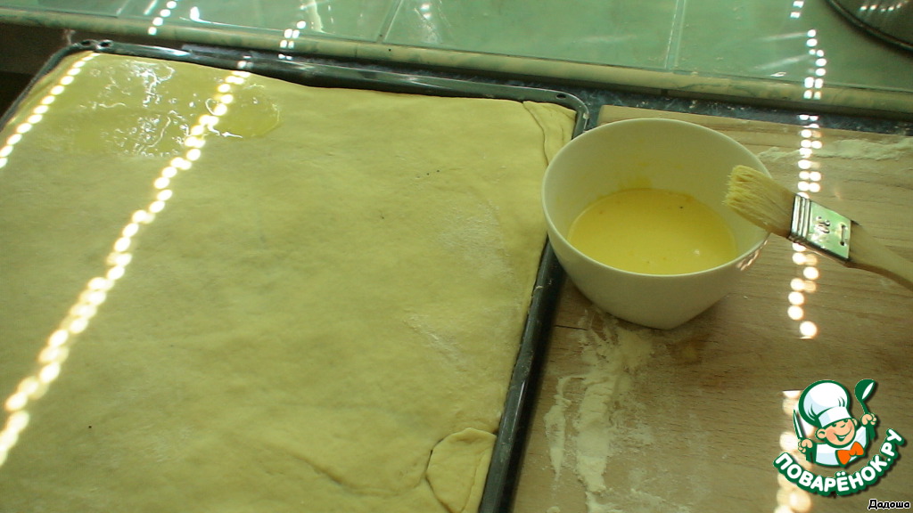 Верхний слой тоже притаптываем. В отдельной посуде взбиваем яичный желток, добавляем 2-3 ст. ложки молока, снова взбиваем и полученной смесью смазываем верхний корж.