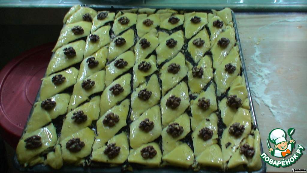 | Идея этого блюда пришла абсолютно спонтанно год назад, а вот сейчас решила повторить к большому православному празднику - первому Спасу (Маковею). Прошу прощения у истинных знатоков восточной кухни, что применила к этому десерту название Пахлава, но на этот вариант меня подтолкнула именно пахлава. Мне показалось, что идея выпекания по типу пахлавы будет гораздо вкуснее классического макового рулета, и НЕ ОШИБЛАСЬ!!! Очень рекомендую для любителей маковой выпечки, хотя повозиться, конечно, придется. |