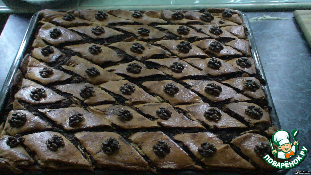 Через 10 минут вынимаем, убавляем жар до 160 градусов. Берем нож и по намеченному контуру прорезаем наши пирожные до самого дна деко. Украшаем долькой грецкого ореха, снова смазываем яично-молочной смесью и в духовку.