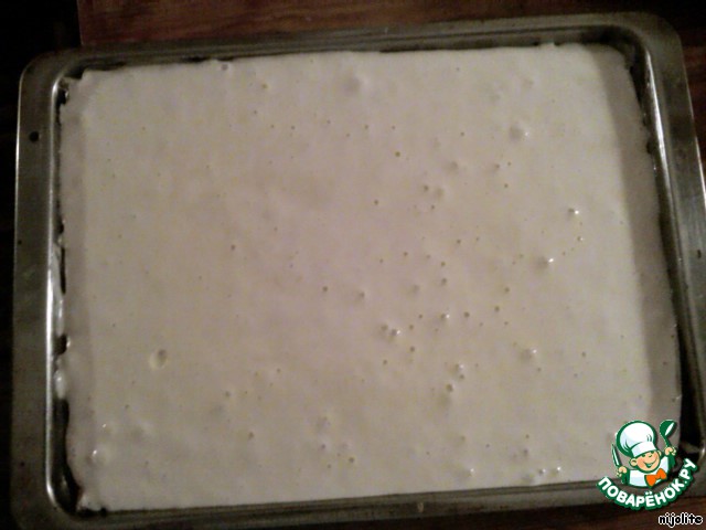 Духовку заранее разогреть, противень застилаю промасленной бумагой. Готовое тесто выливаем на противень и сразу выпекаем, иначе опадёт.