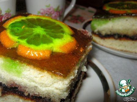 Разрезала корж пополам вдоль, промазала черносмородиновым джемом. Верх слегка смазала остывшим желе, выложила кружочки апельсина и покрыла оставшимся желе. Оставила до утра пропитываться.