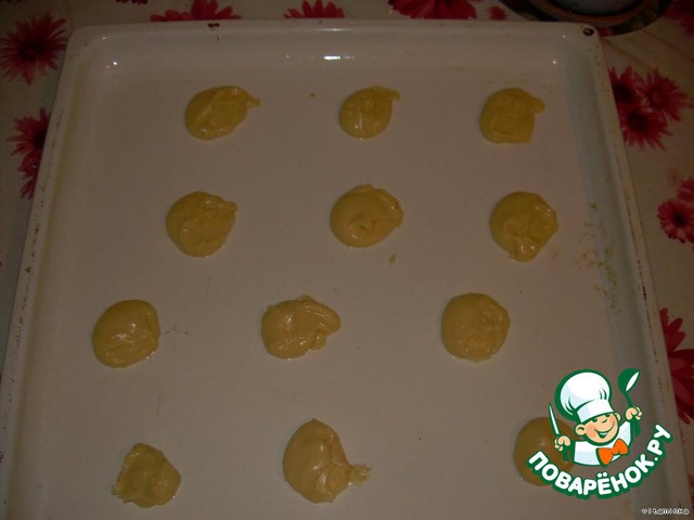 противень смазать маслом. выкладывать маленькие шарики из теста чайными ложечками. выпекать в предварительно разогретой духовке (200) 25-30 минут