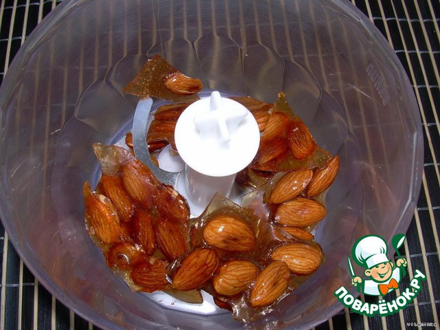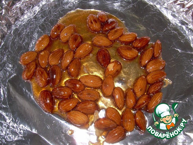 немного обжариваем миндаль на сковороде. кладем его в кастрюльку, добавляем 50 г сахара и 2 ст.л. воды. варим карамель до золотисто-коричневого цвета.