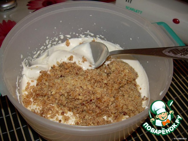 готовим начинку. Сливки и амаретто взбиваем в крутую пену, добавляем миндальную крошку