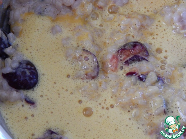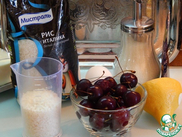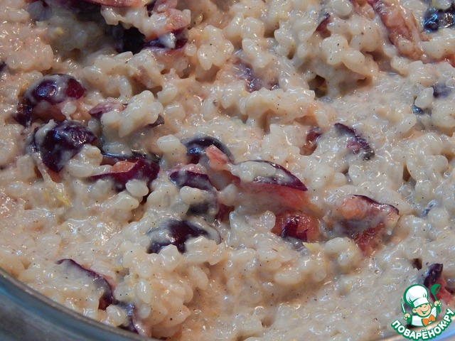Выкладываем рис в отдельную посуду, даем немного остыть и подмешиваем цедру и кусочки черешни.