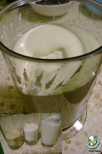 Теперь тесто-начинка: вначале отделим белки от желтков. Белки уберем в холодильник. В желтки добавим сахар и взобьем добела, затем добавим сметану и муку, размешаем или взобьем до однородной пышной массы (у меня стакан равен 1,5 обычного граненого стакана, поэтому на фото пропорции меньше!)