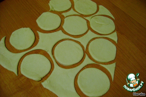 Теперь займемся дрожжевым тестом: тесто раскатаем очень тонко, вырежем кружочки по размеру наших формочек.