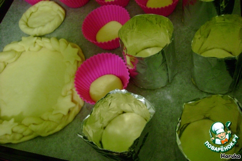 В идеале нужны формочки без дна - я сделала из фольги по форме стакана (это долго, жестяных нет). Можно положить на дно силиконовых формочек, сделать пирог с бортиком и т.д и т.п!!!