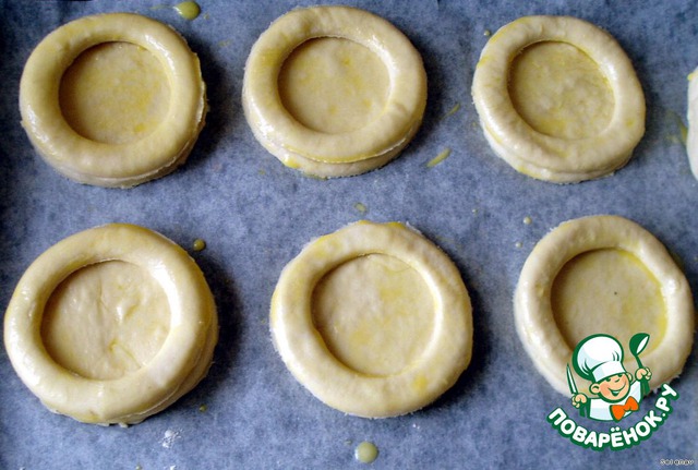 Полученные колечки теста поместить поверх лепешек и смазать желтком