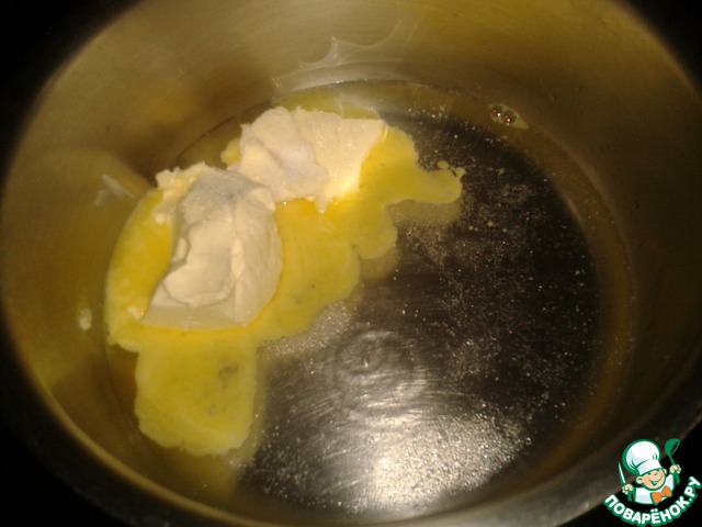 В кастрюлю положить масло, сахар, воду, соль, поставить на огонь, довести до кипения.