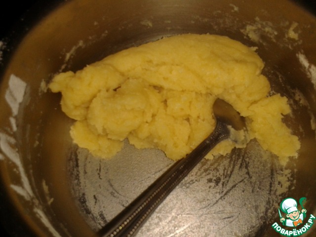 Просеять муку с ванилином и заварить тесто, которое отстает от стенок кастрюли. Снять с огня. Горячее тесто взбивать до остывания, после чего добавить по одному яйца.