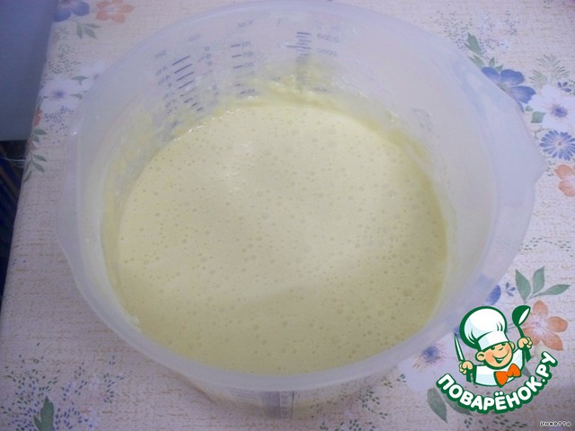 Добавить сметану, ванилин, сахар, муку, пекарский порошок.