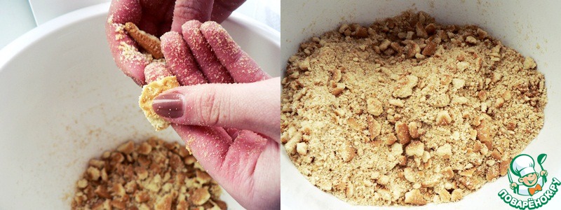 -И тут мой первый совет: не толките печенье скалкой, не пытайтесь поломать сразу же всё количество- ничего дельного не получится, по крайней мере у меня не получилось. Лучше поломать на кусочки каждое печень в отдельности. Результат сэкономленное время, силы, а главное, получите кусочки нужных размеров!