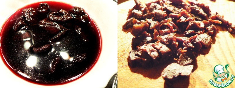 Чернослив замочить в вине на час - полтора, затем слить вино, нарезать сухофрукты на небольшие кусочки.