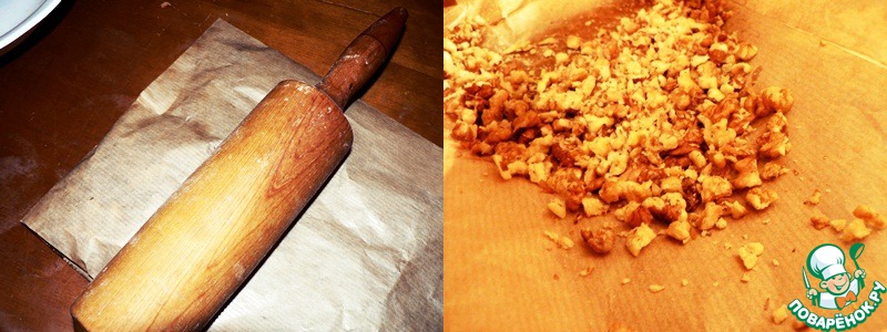 Измельчить грецкие орехи. Для этого переложить орехи в бумажный мешок и несколько раз прокатать скалкой.