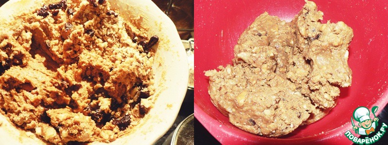 Добавить оставшееся печенье, орехи, чернослив, надеть перчатки и вымесить «тесто», до однородной массы по консистенции, напоминающий пластилин.