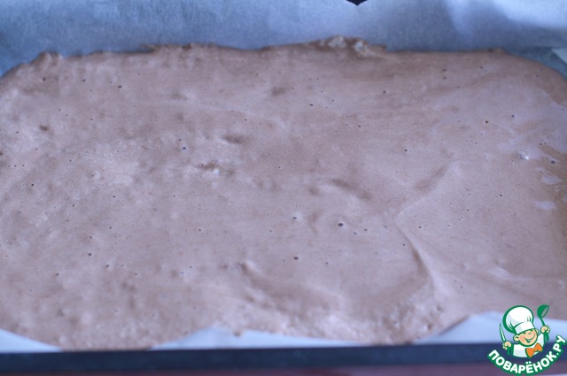 4. Затем аккуратно ввести белки, перемешивая лопаткой. Форму, у меня 35*15см застелить пергаментом, вылить тесто. Духовку разогреть до 180С. Печь бисквит примерно 20 минут до сухой лучины.