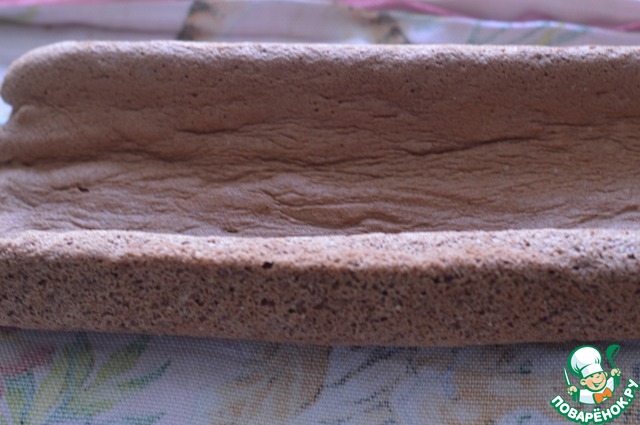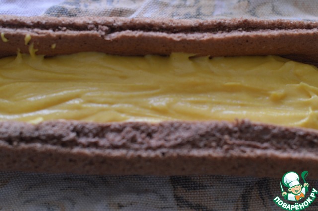 5. Затем форму вынуть, бисквит переложить на полотенце, снять пергамент и свернуть бисквит рулетом, затем развернуть и отложить.