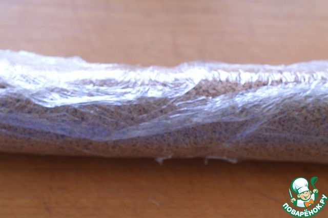 9. Соединить плотно края. Завернуть получившийся рулет в пищевую пленку. Убрать в холодильник на пару часов.