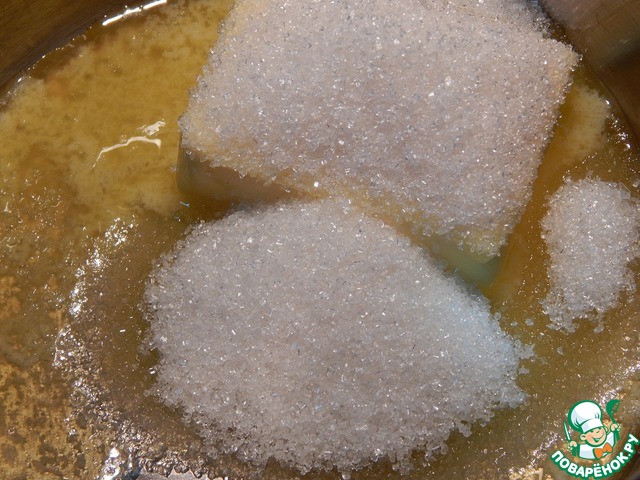 В кастрюле растапливаем сливочное масло и 1/4 стакана сахара. Перемешиваем до однородной массы.