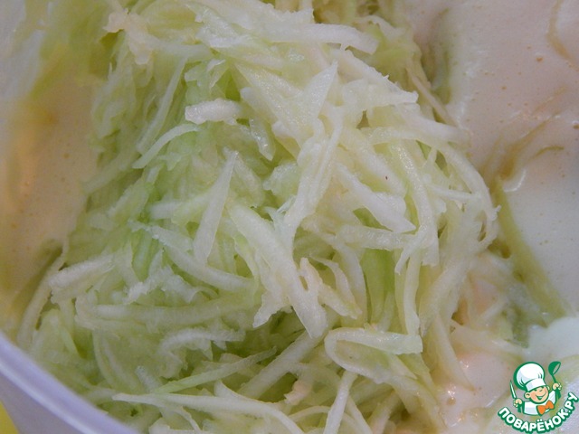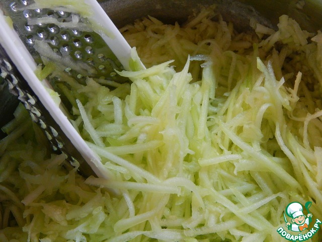 Тем временем, очищаем и натираем кабачок на крупной терке. У нас получается 2 с небольшим стакана натертого и отжатого кабачка.