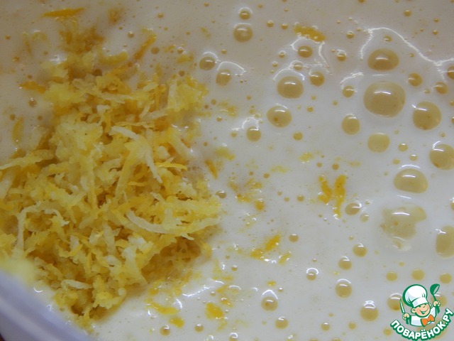 Взбиваем 2 целых яйца, белок третьего яйца и сахар. Добавляем лимонный сок и цедру.
