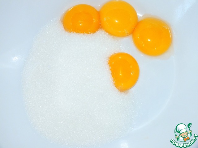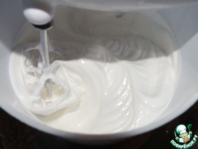 Пока печется корж, нужно взбить миксером белки с сахаром до устойчивых пиков (минут 10).
