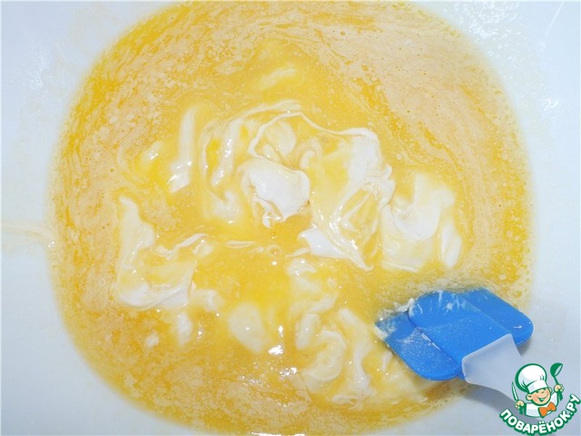 Всыпать просеянную муку с разрыхлителем. Взбить до однородности. Тесто выложить в форму для выпечки. Выпекать в горячей духовке 20 минут.