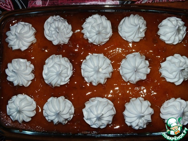 Безе переложить в кулинарный мешок и отсадить на пирог безешки. Поставить обратно в духовку еще на 20 минут. Готовый пирог остудить, и нарезать на квадраты. Приятного аппетита!