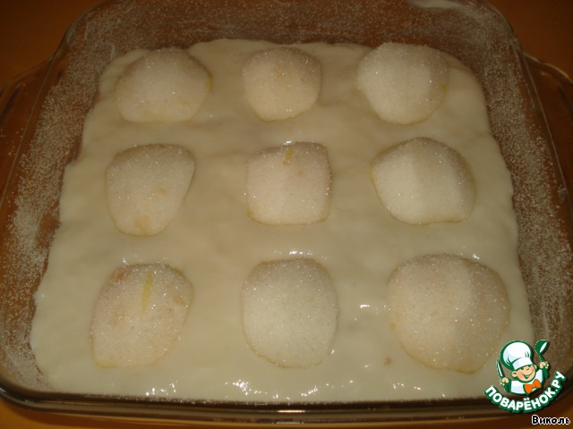 Вылить крем на тесто и выложить четвертинки яблок, обмакнув их в сахар. Собиралась еще на каждом кусочке сделать неглубокие надрезы, но духовка уже давно нагрелась и хотела печь, поэтому сделала только на одном.
