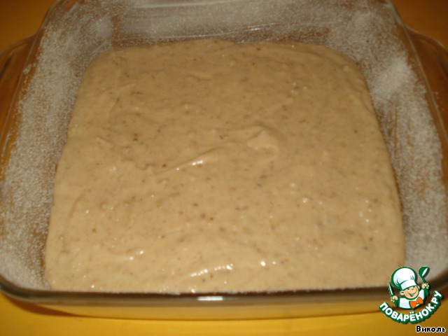 Полученное тесто вылить ровным слоем в смазанную маслом форму. Рекомендовалась форма размером 23х23 см, но у меня такой не нашлось, использовала стеклянную огнеупорную форму 21х21 см. Пекла в ней впервые, поэтому на всякий случай присыпала еще и манкой.