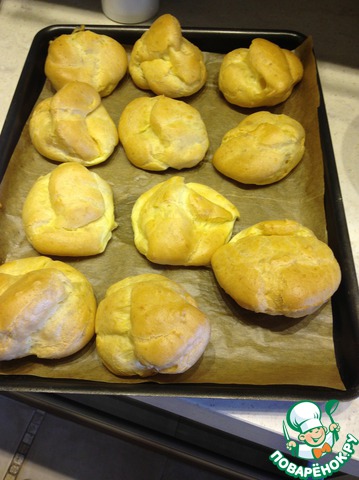 Вынуть из духовки пирожные, тесто очень сильно увеличится в размере, раза в 4. Дать остыть, сделать надрезы для того, чтобы начинить кремом.