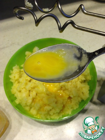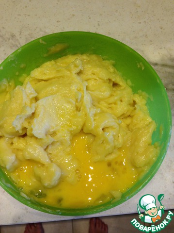 В тесто, остывшее до 60-70 градусов, влить 3-4 столовые ложки яиц (если вливать яйца в горячее тесто, они свернутся). Тщательно перемешать ложкой или специальной насадкой для миксера.