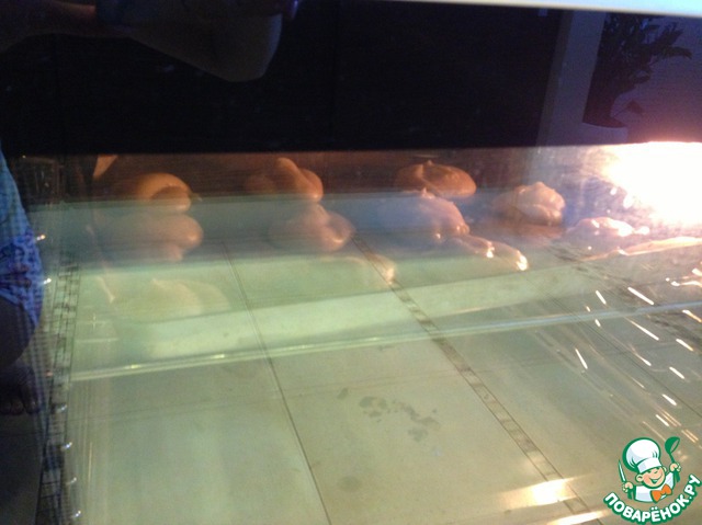 С помощью кондитерского мешка или просто плотного пакета выдавить на противень, застеленный пергаментной бумагой, круглые лепешки диаметром около 6-7 сантиметров. Поставить в разогретую до 200 градусов духовку на 20 минут, затем уменьшить температуру до 150 градусов, а через 10 минут до 100 градусов. Всего выпекание займет 40-50 минут.