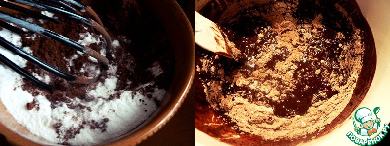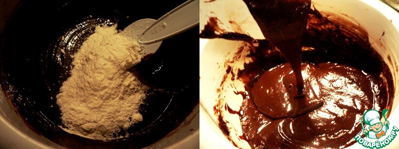 Муку смешать с пекарским порошком, в несколько подходов ввести в шоколадную массу, всё очень тщательно перемешивать лопаткой.