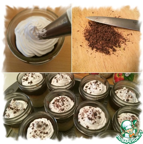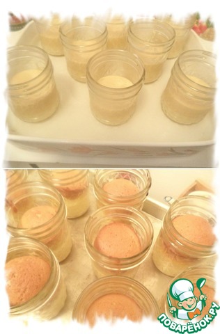 Аккуратно выложить бисквит сверху на остывший крем примерно высотой 2 см. Для удобства можно переложить тесто в кулинарный мешок и уже из него заполнять баночки бисквитом.